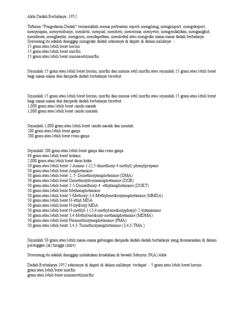 Sebagai peguam kes di bawah seksyen 39a 1 akta dadah berbahaya 1952 adalah di antara kes yang kebiasaanya anak guam tertuduh akan mohon bicara disebabkan hukuman minimum yang ditawarkan ditetapkan di bawah akta dadah berbahaya 1952 adalah mandatori penjara dan sebat iaitu minimum 2 tahun penjara dan 3 sebatan. Tertuduh didakwa mengikut seksyen 15 1 a akta dadah berbahaya 1952 dan sabit kesalahan boleh didenda tidak lebih rm5 000 atau penjara tidak lebih dua tahun. E xport of dangerous drugs 20. P rohibition of trade etc in new drugs and pow er to apply p art iv w ith or w ithout m odifications to certain drugs p a r t v c o n t r o l o f e x t e r n a l t r a d e 18.