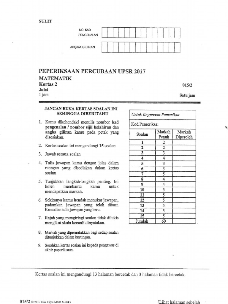 Soalan Peperiksaan Matematik Kertas 2 Upsr 2017