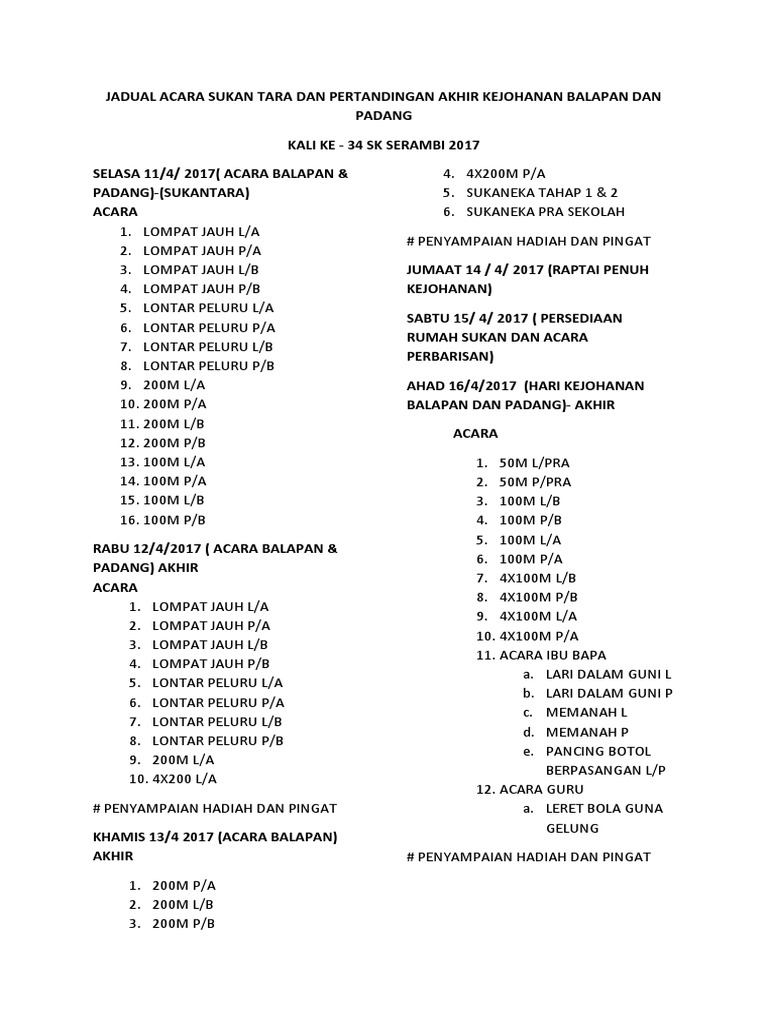 Jadual Pertandingan Kejohanan Balapan Dan Padang Mssd Tangkak Ke Mac 2017 Ahad Pdf Download Gratis