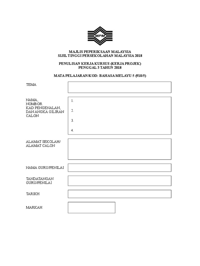 Majlis Peperiksaan Malaysia Sijil Tinggi Persekolahan Malaysia 2018 Penulisan Kerja Kursus Kerja Projek Penggal 3 Tahun 2018 Mata Pelajaran Kod Bahasa Melayu 5 910 5
