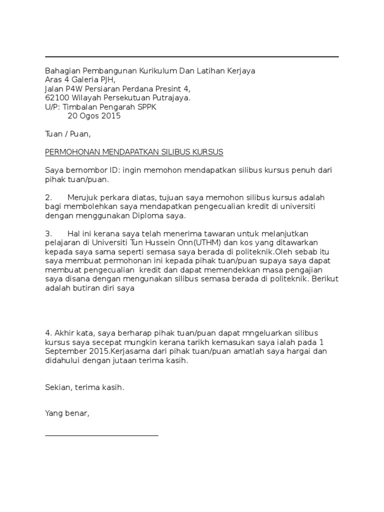 Surat Rasmi Memohon Silibus Kursus Docx