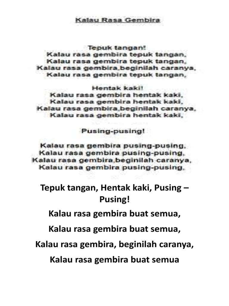 Lirik lagu kalau rasa gembira. Kalau rasa gembira tepuk tangan if you re happy and you know it clap your hands kalau rasa gembira tepuk tangan if you re happy and you know it clap your. Kalau kita rajin usaha ibubapa gembira mari kawan sama sama pasti kita berjaya. Didi friends lagu kanak kanak 64 380 816 views 2 22 lagu kanak kanak melayu malaysia kalau rasa gembira if you are happy and you know it in malay duration. Clap your hands stomp your leg twist your finger hit your lap say hurray do it all if you re happy you know it clap your hands 2x if you re happy you know it you really want to show it if you re happy you know it clap your hands.