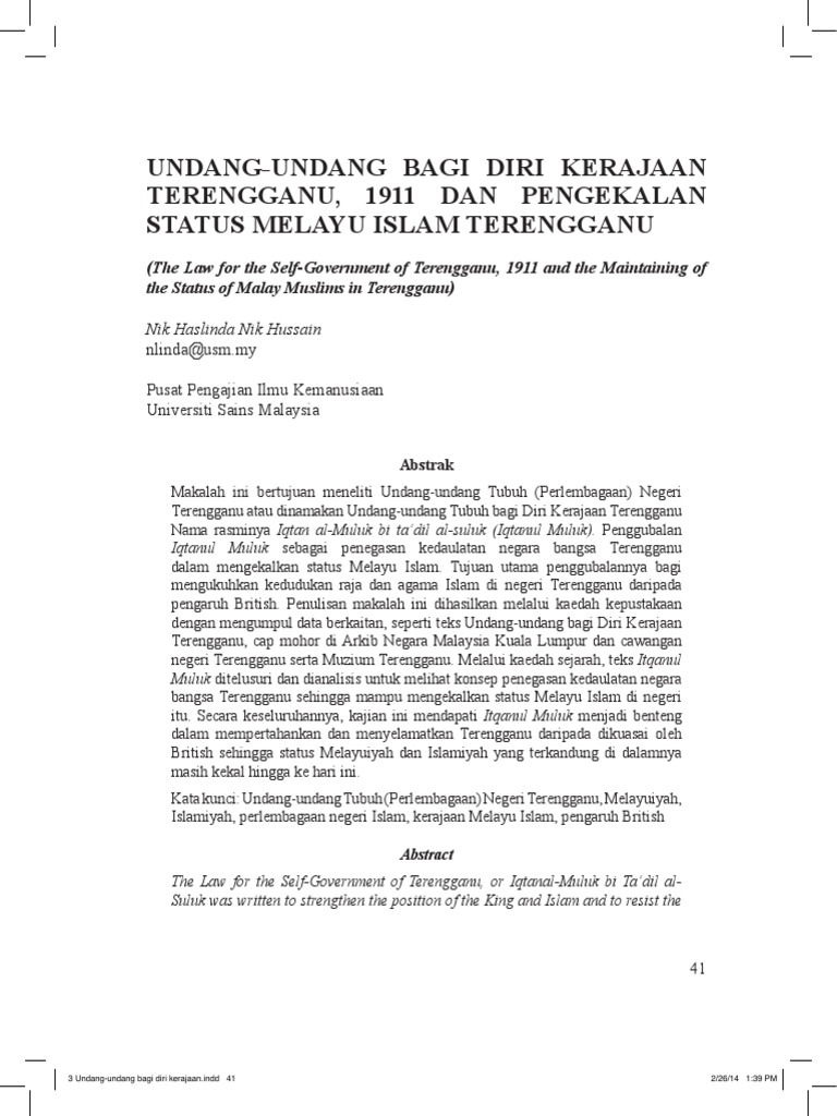 Undang Undang Bagi Diri Kerajaan Terengganu 1911 Kuasa Raja Dan Pengaruh Islam Dalam Sebuah Kerajaan Melayu Ukm Journal Article Repository