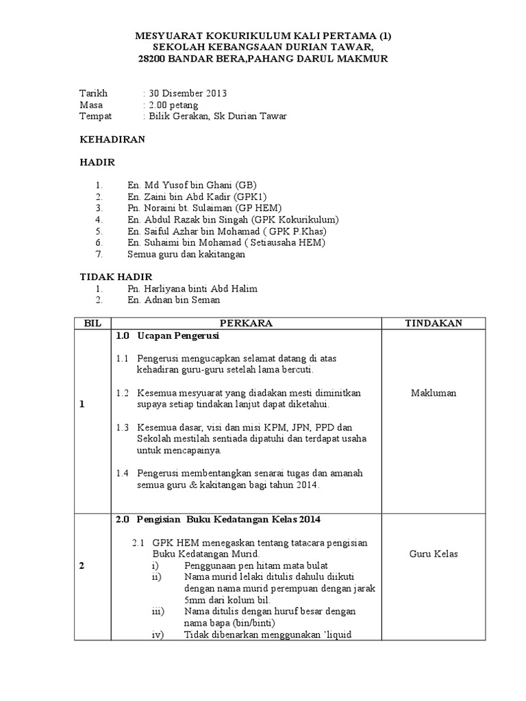 Minit Mesyuarat Hal Ehwal Murid Kali Pertama 2014